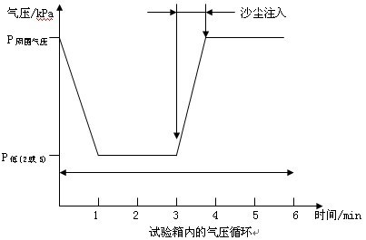 試驗用塵:試驗用塵是干燥的非磨蝕性的細粉塵,能夠通過篩孔為75µm,金屬絲直徑為50µm的平面網(wǎng)狀篩。本試驗中可以使用滑石粉,分析表明它可以滿足要求。試驗用塵使用次數(shù)不應超過20次。應注意維持干燥以保持粉塵細度,使用前應在80℃下烘干2h. 塵濃度:試驗用塵的數(shù)量應能夠使箱底基準表面上的沉降量均勻維持在(600±200)µ/(m²•h)。 氣流:試驗箱內(nèi)的氣流應主要是自上而下的垂直氣流,而非層流。 氣流速度:氣流速度應能夠使塵在試驗箱內(nèi)均勻分布。 濕度:試驗箱內(nèi)的相對濕度應小于15%。可以通過提高試驗箱濕度實現(xiàn)。 樣品內(nèi)氣壓:根據(jù)樣品的運行條件,樣品外殼可以分為兩種類型: 類型1:樣品外殼內(nèi)的氣壓可能會與外界大氣壓不同,例如由運行中的熱力循環(huán)引起氣壓不同。 類型2:樣品外殼內(nèi)的氣壓跟外界氣壓相同。 相關(guān)規(guī)范應闡明樣品外殼類型和壓力降。 砂塵試驗箱對于具有類型1外殼的樣品,應放入試驗箱,并按照正常使用位置安裝。樣品應承受圖中規(guī)定的壓降周期。根據(jù)相關(guān)規(guī)范中規(guī)定,壓力降應為2kPa(20mbar)或5kPa(50mbar) 。 如圖所示,塵應在每個循環(huán)周期內(nèi)注入。 對于具有類型2外殼的樣品,應放入試驗箱,并按照正常使用位置安裝。此種情況下,不應使用真空泵。