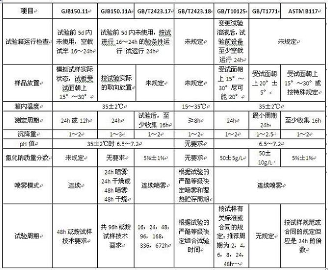 鹽霧試驗箱要保證試驗結(jié)果的正確性,必須控制好試驗過程。試驗過程的控制包括:試驗箱運行檢查、樣品放置、箱內(nèi)暴露區(qū)溫度、沉降液的參數(shù)(沉降量、PH值和氯化鈉質(zhì)量濃度)等,不同標準對鹽霧試驗過程的控制要求見下表: