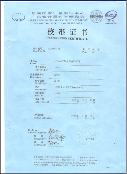 >>振動試驗臺校準(zhǔn)證書-廣東計量院-ABB集團