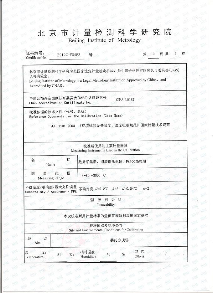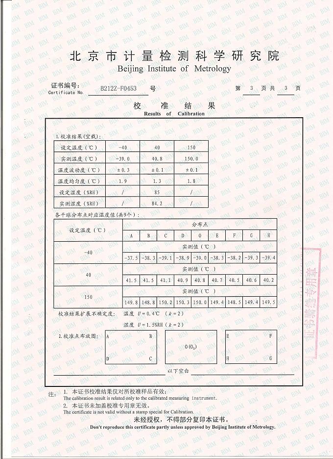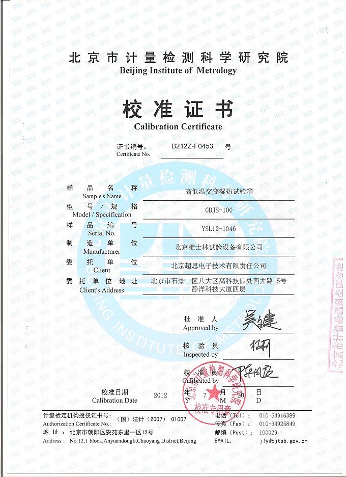 高低溫交變濕熱試驗箱校準證書-北京計量院-超思電子