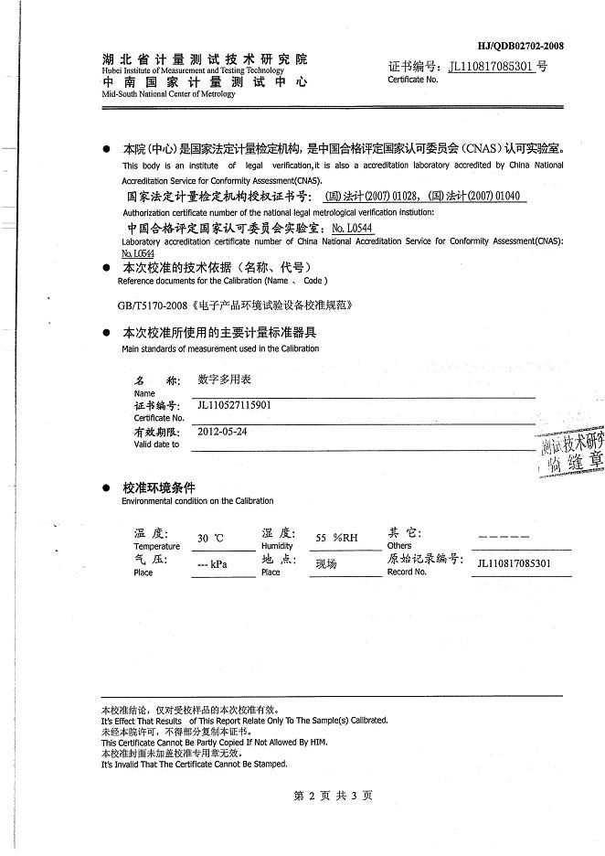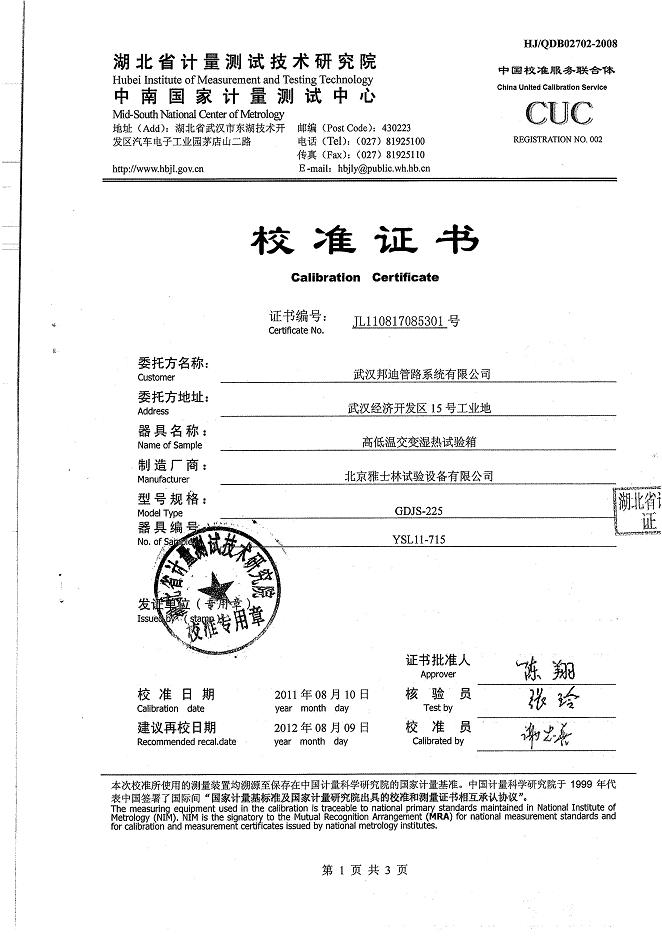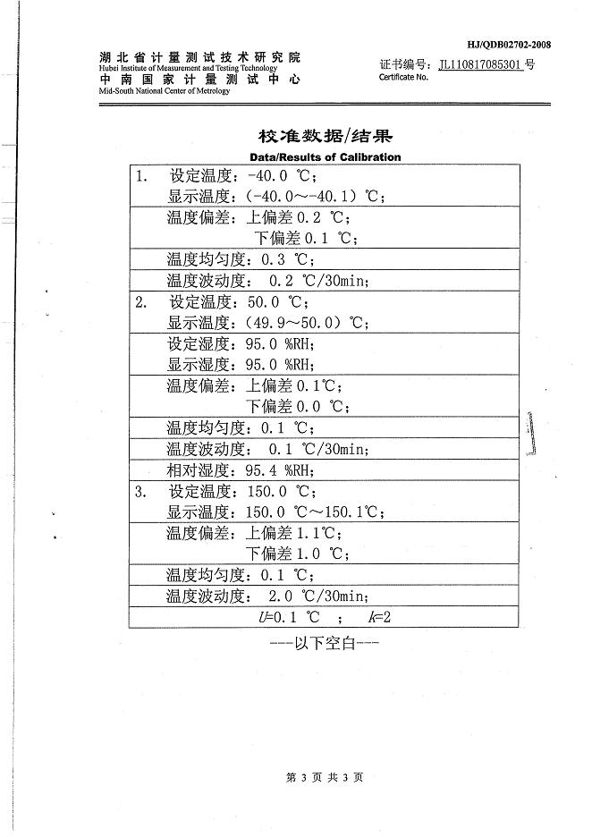 >>高低溫交變濕熱試驗(yàn)箱校準(zhǔn)證書-湖北計(jì)量院-武漢邦迪